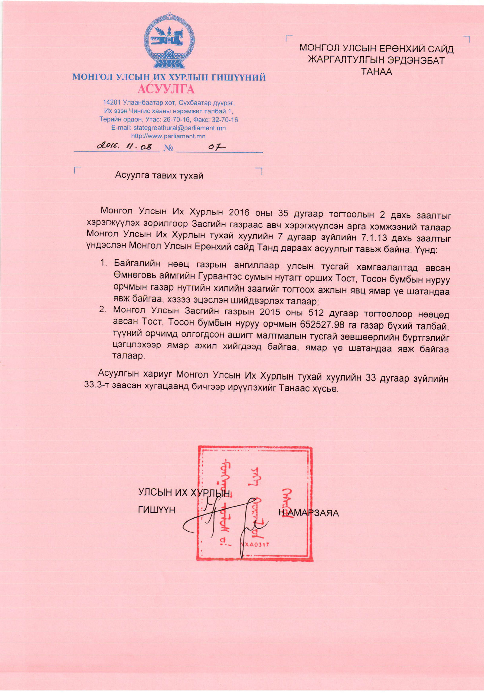 Тэрбээр Өмнөговь аймгийн Гурвантэс сумын нутагт орших Тост, Тосонбумбын нуруу орчмын газар нутгийн хилийн заагийг тогтоох ажлын явц болон түүний орчимд олгогдсон ашигт малтмалын тусгай зөвшөөрлийн бүртгэлийг цэгцлэхээр хийсэн ажлын талаар бичгээр ирүүлэхийг хүсчээ.