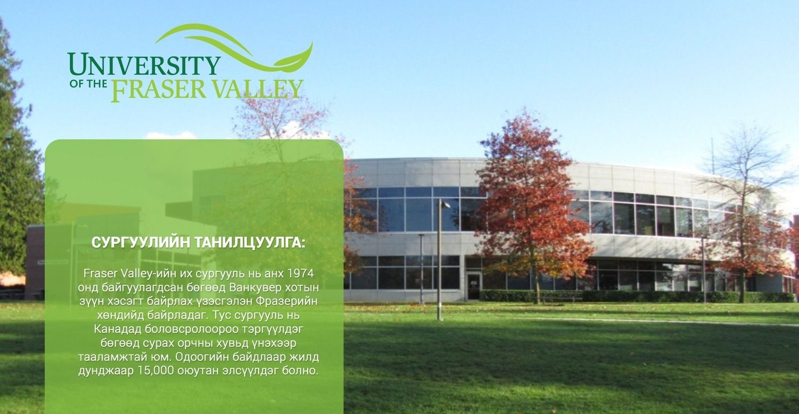 Fraser Valley-ийн их сургууль нь анх 1974 онд байгуулагдсан бөгөөд Ванкувер хотын зүүн хэсэгт байрлах үзэсгэлэн Фразерийн хөндийд байрладаг. Тус сургууль нь Канадад боловсролоороо тэргүүлдэг бөгөөд сурах орчны хувьд үнэхээр тааламжтай юм. Одоогийн байдлаар жилд дунджаар 15,000 оюутан элсүүлдэг болно.