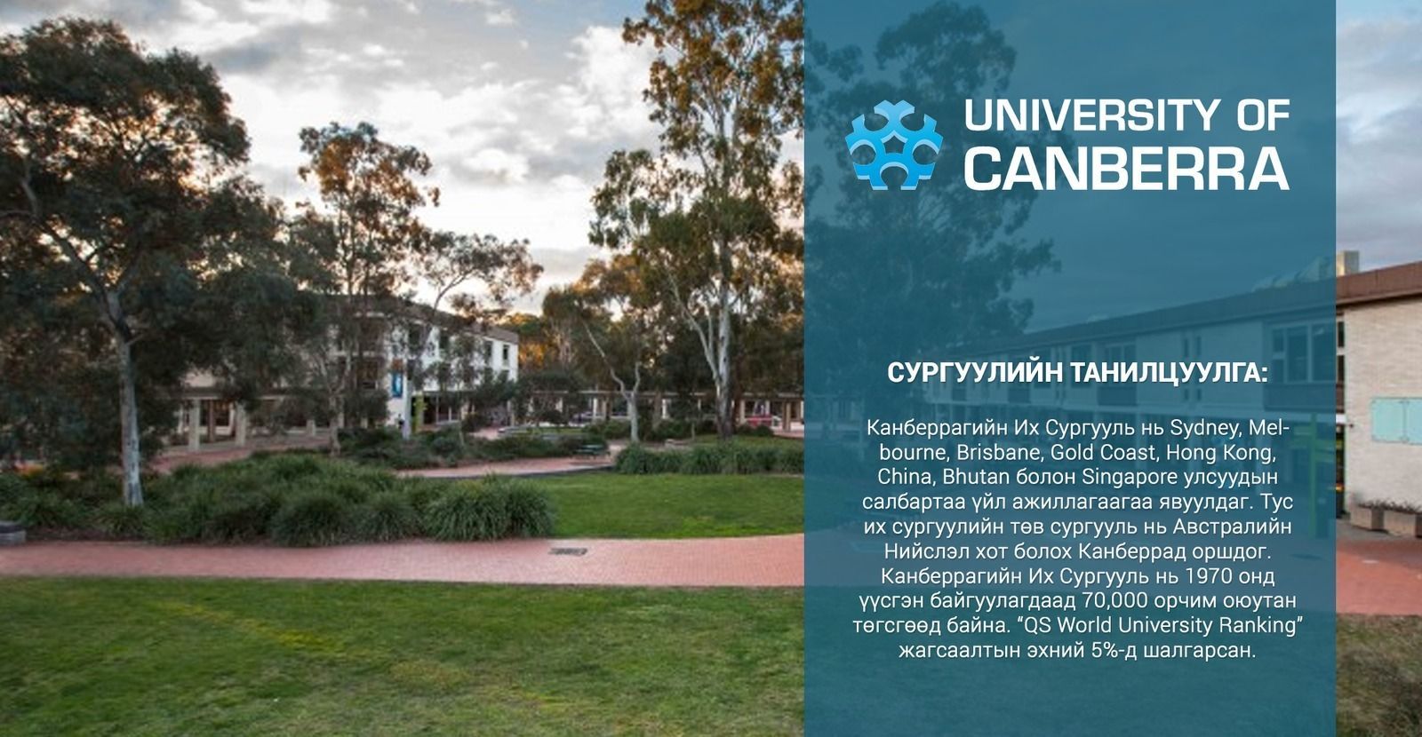 Сургуулийн танилцуулга: Канберрагийн Их Сургууль нь Sydney, Melbourne, Brisbane, Gold Coast, Hong Kong, China, Bhutan болон Singapore улсуудын салбартаа үйл ажиллагаагаа явуулдаг. Тус их сургуулийн төв сургууль нь Австралийн Нийслэл хот болох Канберрад оршдог. Канберрагийн Их Сургууль нь 1970 онд үүсгэн байгуулагдаад 70,000 орчим оюутан төгсгөөд байна. “QS World University Ranking” жагсаалтын эхний 5%-д шалгарсан.