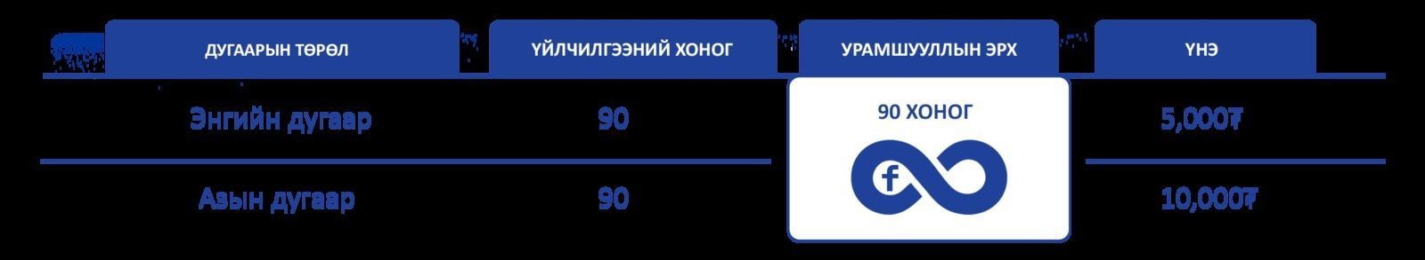 Фэйсбүүкийг ашигладаг шинэ хэрэглэгчдэдээ бас нэгэн таатай нөхцөлийг бид санал болгож байна. 90 хоногийн турш Фэйсбүүкийг хязгааргүй ашиглах дугаарыг та дараах нөхцөлөөр авах боломжтой.