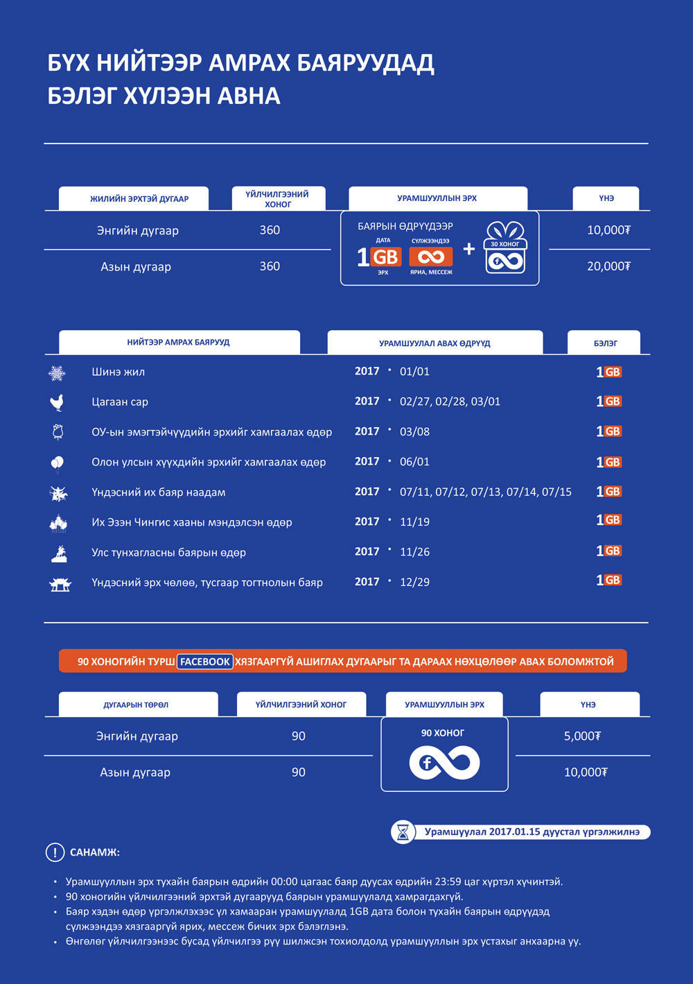 Энэ удаад бид Урьдчилсан төлбөрт үйлчилгээний шинэ хэрэглэгчдэдээ зориулан бүтэн жилийн турш Шинэ жил, Цагаан сар, Олон улсын эмэгтэйчүүдийн баяр, Эх үрсийн баяр, Үндэсний их баяр наадам, Их эзэн Чингис хааны мэндэлсэн өдөр, Улс тунхагласны баяр, Үндэсний эрх чөлөөний өдөр гээд бүх нийтийн баярын амралтын өдрүүдээр 1GB дата, сүлжээндээ ХЯЗГААРГҮЙ ярих, ХЯЗГААРГҮЙ мессеж бичих бэлэгтэй, бүтэн жилийн үйлчилгээний эрхтэй шинэ дугаарыг онцгой нөхцөлөөр худалдаанд гаргалаа.