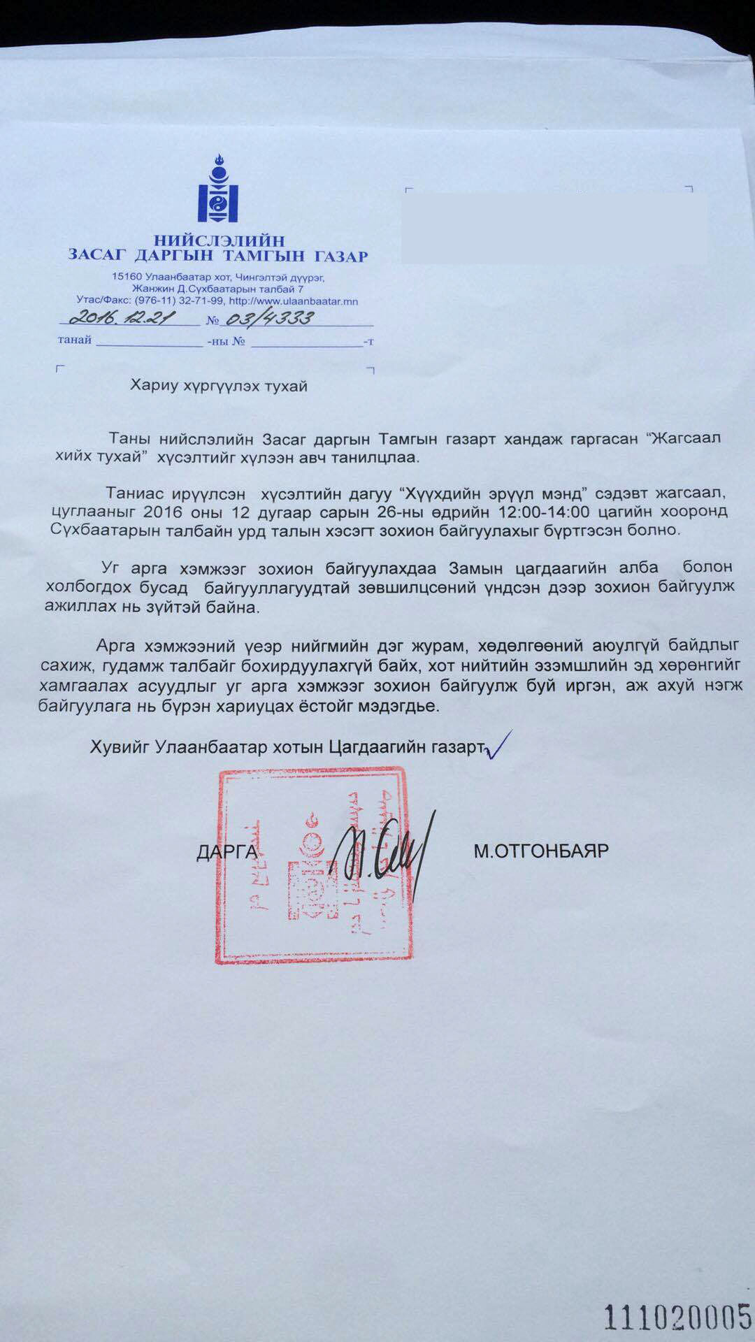 Утааны эсрэг ээж, аавууд нэгдэн энэ сарын 26-нд жагсаал зохион байгуулахаар санаачлаад байгаа билээ. Зохион байгуулагчдын зүгээс жагсаал хийх хүсэлтээ энэ сарын 19-нд өгсөн бөгөөд Нийслэлийн Засаг Даргын Тамгын Газраас ирэх Даваа гарагт 12:00 - 14:00 цагийн хооронд жагсаал хийх зөвшөөрөл олгосон байна.