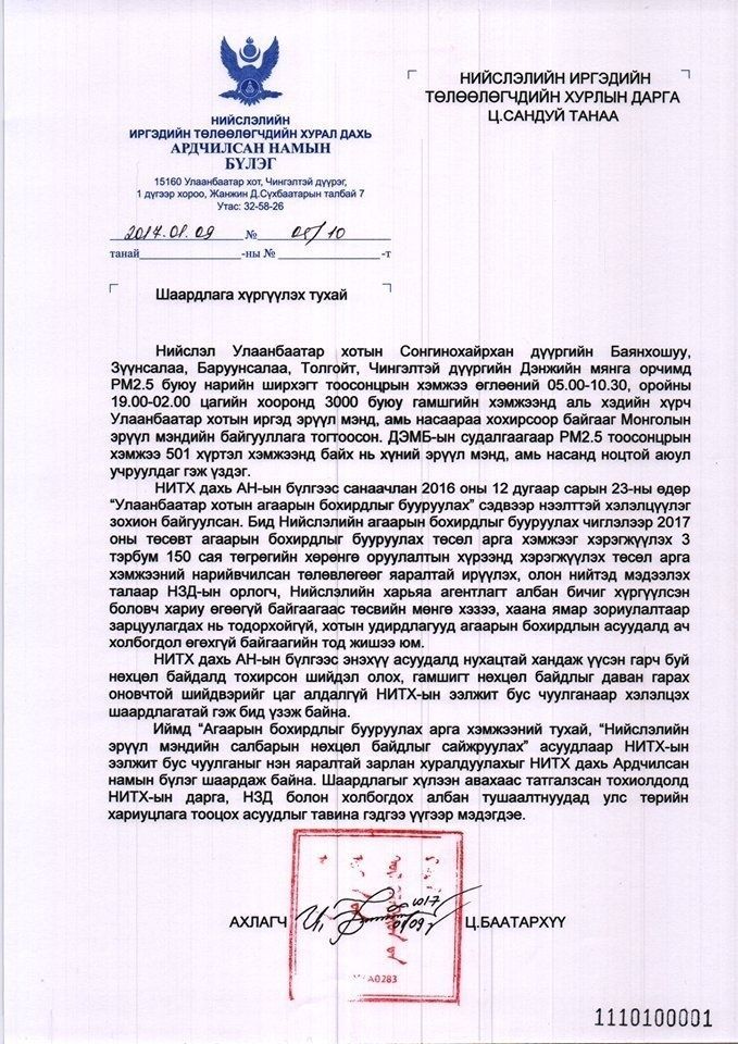 Нийслэл Улаанбаатар хотын Сонгинохайрхан дүүргийн Баянхошуу, Зүүнсалаа, Баруунсалаа, Толгойт, Чингэлтэй дүүргийн Дэнжийн мянга орчимд РМ2.5 буюу нарийн ширхэгт тоосонцрын хэмжээ өглөөний 05.00-10.30, орой 19.00-02.00 цагийн хооронд 3,000 буюу гамшгийн хэмжээнд аль хэдийн хүрч Улаанбаатар хотын иргэд эрүүл мэнд, амь насаараа хохирсоор байгааг Монголын эрүүл мэндийн байгууллага тогтоосон.