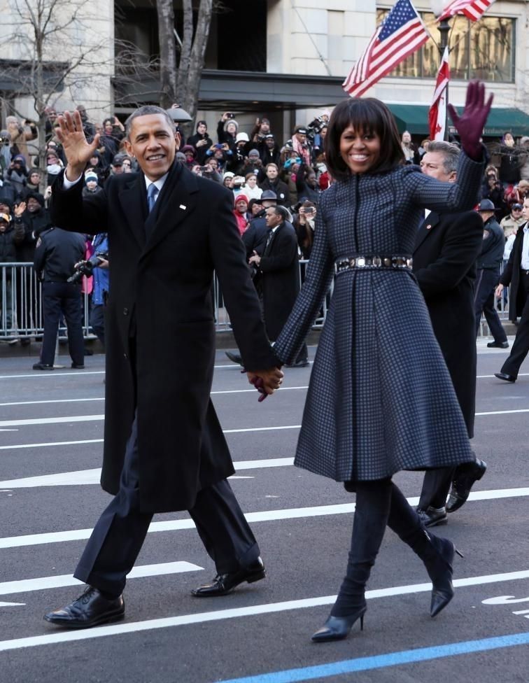 Тэргүүн хатагтай Мишел Обама 2009 болон 2013 оны тангараг өргөх ёслолын үеэр ерөнхийлөгч Обамагийн хамт. Тэрбээр эхний удаа Куба гаралтай Америк дизайнер Изабел Толедогийн урласан шар өнгөтэй хослолыг өмссөн бол дараа нь Том Брауны урласан хар хөх хослолыг өмссөн байна.