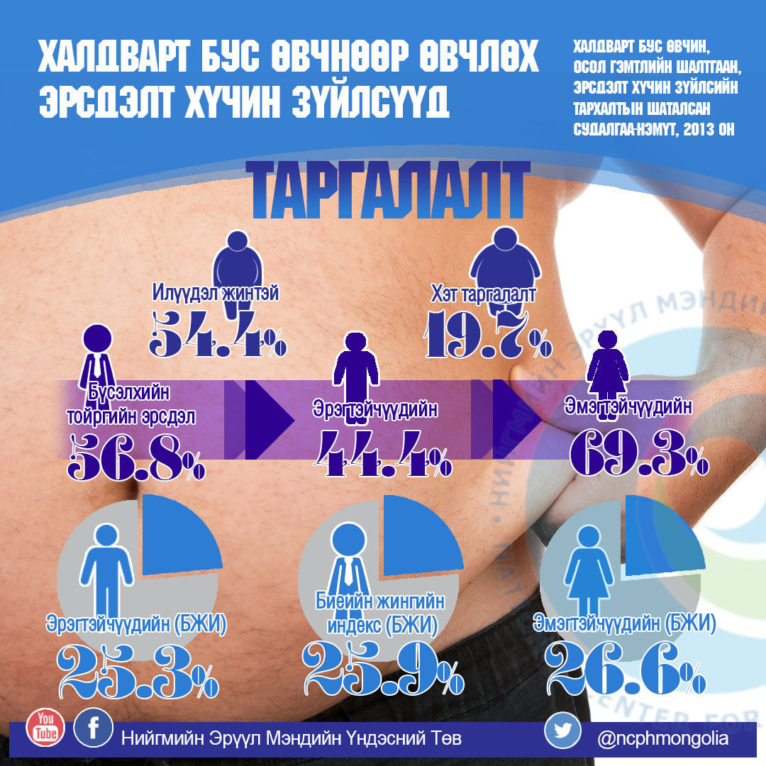 Халдварт бус өвчнөөр өвчлөх эрсдэлт хүчин зүйлийн нэгд таргалалт ордог. Гэтэл монголчуудын дунд таргалалт харьцангуй их байгаа бөгөөд судалгааны дүнгээр монголчуудын 54.4 хувь нь илүү жинтэй гарчээ.
