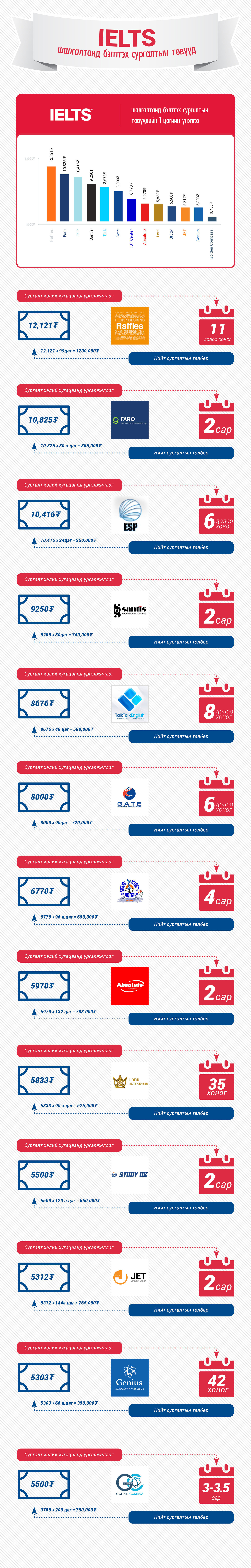 Хэрэв та Англи хэл сурахаар сургалтын төвийн мэдээлэл хайж байгаа бол энэ удаад та бүхэндээ Нийслэлд үйл ажиллагаа явуулдаг томоохонд тооцогдох төвүүдийн IELTS ангийн төлбөр болоод, хөтөлбөрийн дагуу суралцагчид зарцуулах нийт цагийн мэдээллийг хүргэж байна.