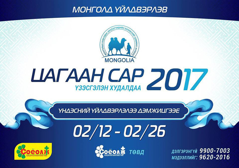 “Үндэсний үйлдвэрлэлээ дэмжицгээе” уриан дор үндэсний томоохон үйлдвэрүүд, гар урчууд, малчид хөдөлмөрчид, дотоодын жижиг дунд бизнес эрхлэгчдийн бараа бүтээгдэхүүнийг бөөний үнээр худалдаалах “Монголд үйлдвэрлэв 2017” цагаан сарын үзэсгэлэн худалдаа “Соёолж” төвд энэ сарын 12-26 өдрийг дуустал зохион байгуулагдах гэж байна.