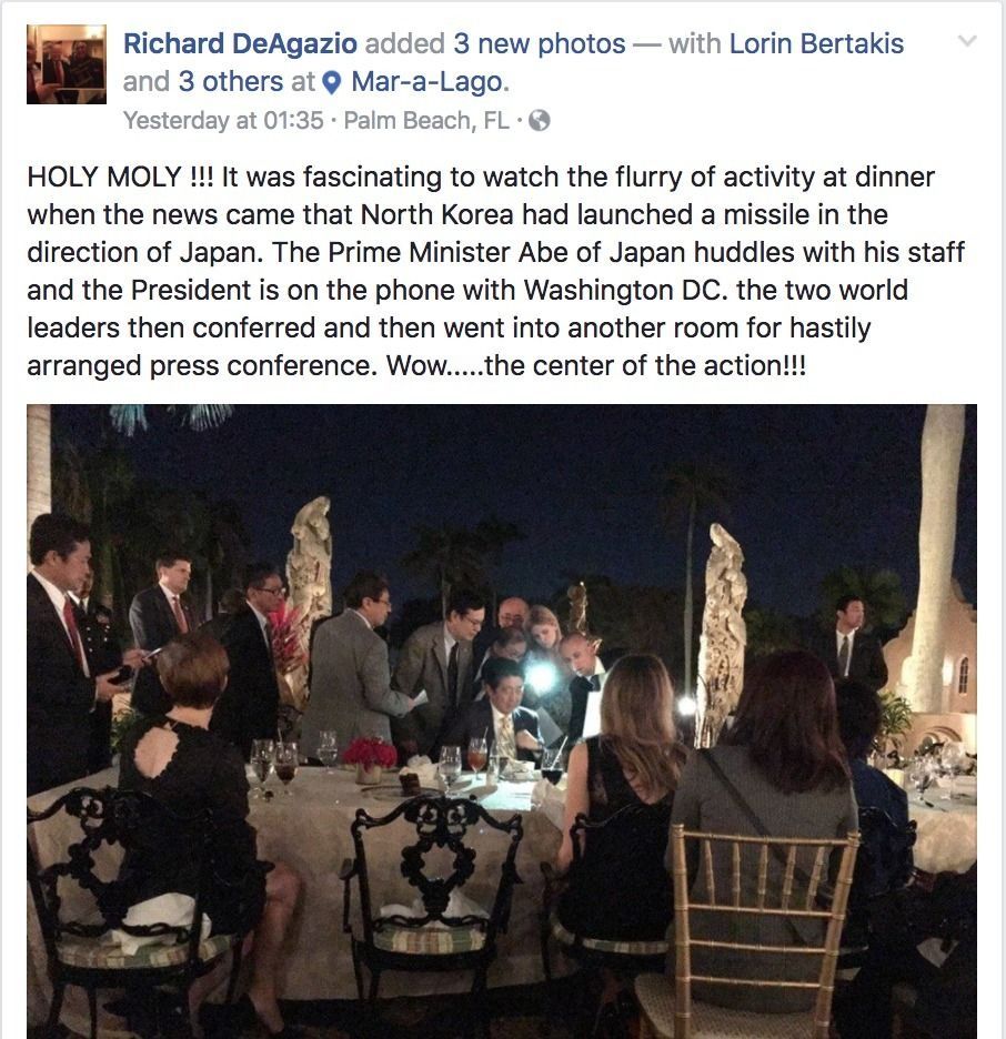 Өнгөрсөн Бямба гарагт хувийн Мар-а-Лаго клубд оройн зоог барьж байсан Дональд Трамп, Шинзо Абэ нарт Хойд Солонгос Японыг чиглүүлэн пуужин харвасан тухай шуурхай мэдээлэл ирсэн байна.
