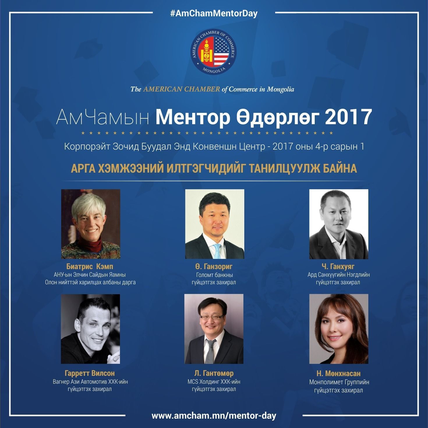Монгол дахь Америкийн Худалдааны Танхим (АмЧам Монгол) нь 2017 оны 4-р сарын 1-ны Бямба гарагт хоёр дахь жилдээ нийгмийн хариуцлагын санаачилгын хүрээнд “АмЧамын Ментор Өдөрлөг 2017”-г Корпорэйт Зочид Буудал Энд Конвеншн Центрт зохион байгуулах гэж байна.