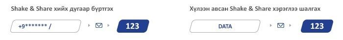Эсвэл дараах түлхүүр үгсийг 123 тусгай дугаарт илгээн Shake & Share нэмэлт үйлчилгээг ашиглах боломжтой.