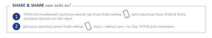 Танд сар бүр өөртөө ашиглах 100MB, 3 найздаа хуваалцах 300MB дата эрх идэвхжинэ. Харин та Shake хийж 3 найздаа тус бүр 100MB дата хуваалцсанаар таны дансанд буцаад 3х100MB=300MB дата нэмэгдэх болно.