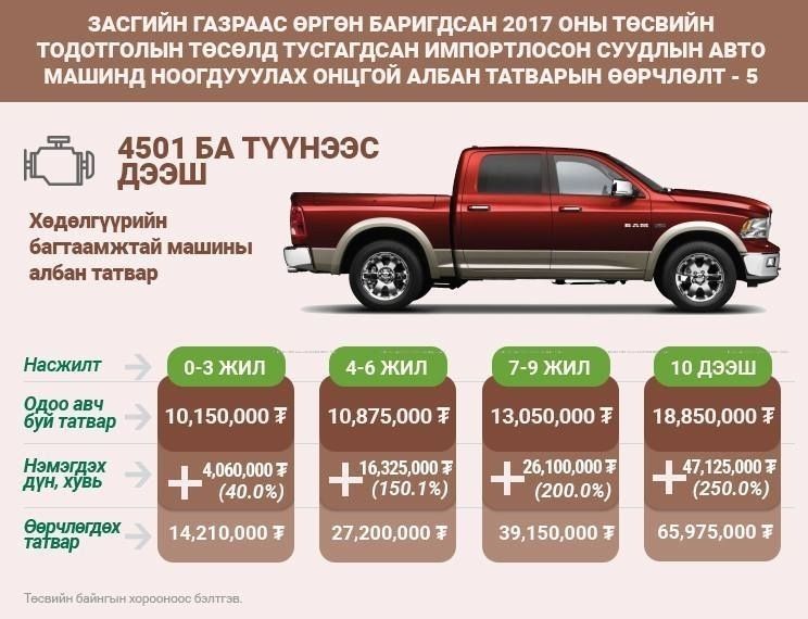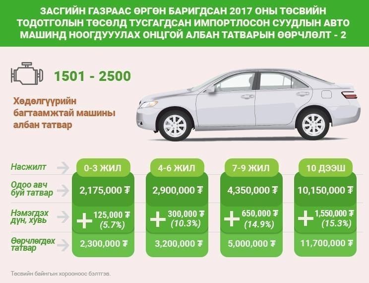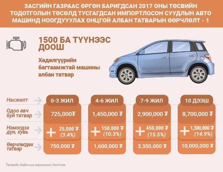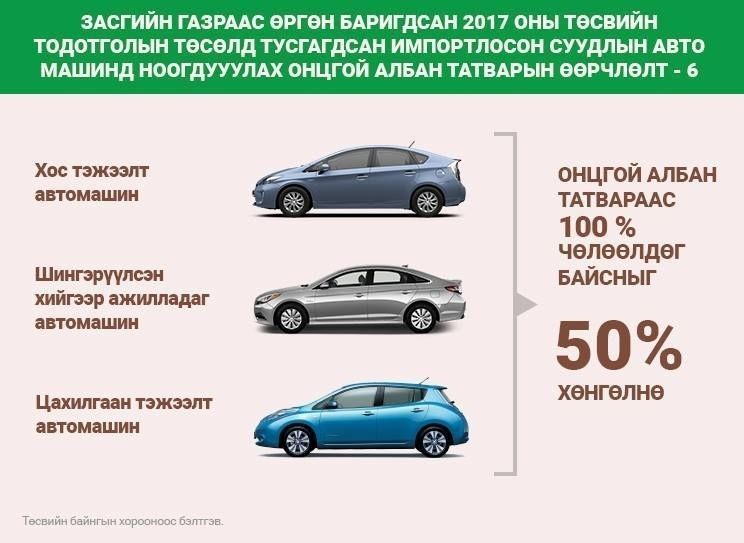 Иймд Онцгой албан татварын тухай хуульд нэмэлт, өөрчлөлт оруулж 2017 оны 5 дугаар сарын 1-ний өдрөөс эхлэн хос тэжээлт автомашин, шингэрүүлсэн хийгээр ажилладаг автомашин, цахилгаан тэжээлт автомашины татварын хөнгөлөлтийг 50 хувиар бууруулж, суудлын автомашины хөдөлгүүрийн цилиндрийн багтаамж, насжилтаас хамааруулж онцгой албан татварын хэмжээг нэмнэ гэж хууль санаачлагчид мэдээлжээ.