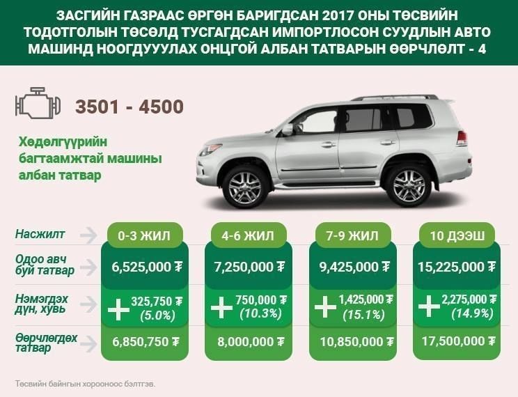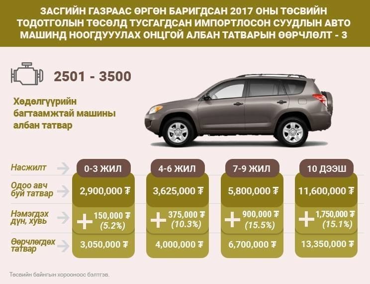 4500см³-аас доош хөдөлгүүрийн багтаамжтай суудлын автомашинд үйлдвэрлэсэн оноос хамааруулж 3-15 хувь, 4501см³-аас дээш хөдөлгүүрийн багтаамжтай суудлын автомашинд 40-250 хувиар тус тус онцгой албан татварын хэмжээг нэмэгдүүлж байна.