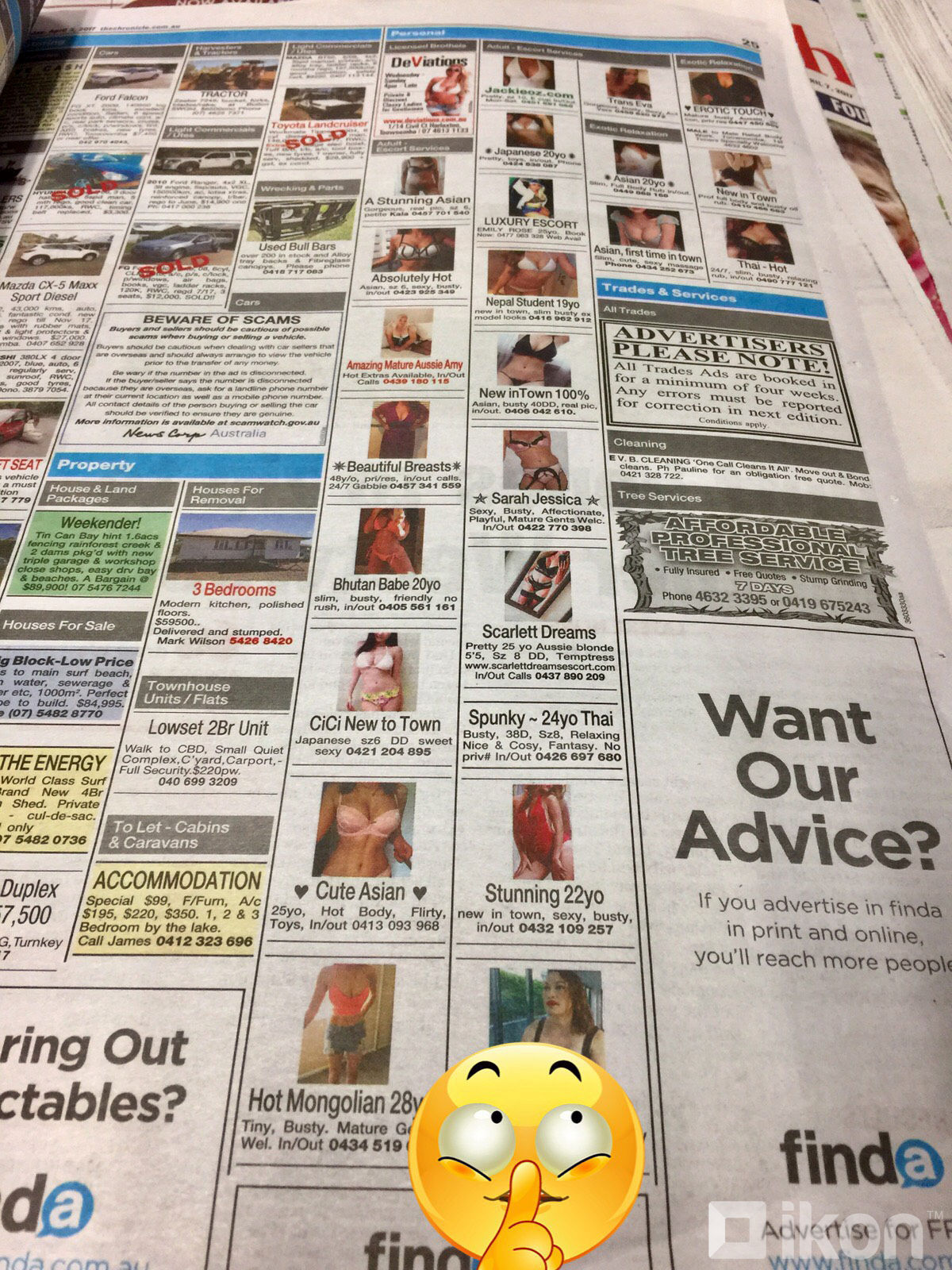 Энэ дундаас “Hot Mongolian girl” гэж бичээд зураг, утасны дугаараа тавьсан зарлал анхаарал татсан юм. Иймэрхүү төрлийн зарлалыг хуулиар хүлээн зөвшөөрдөг талаар Квийнслэндийн Их сургуулийн багш Брүс Вуллэй ярив.