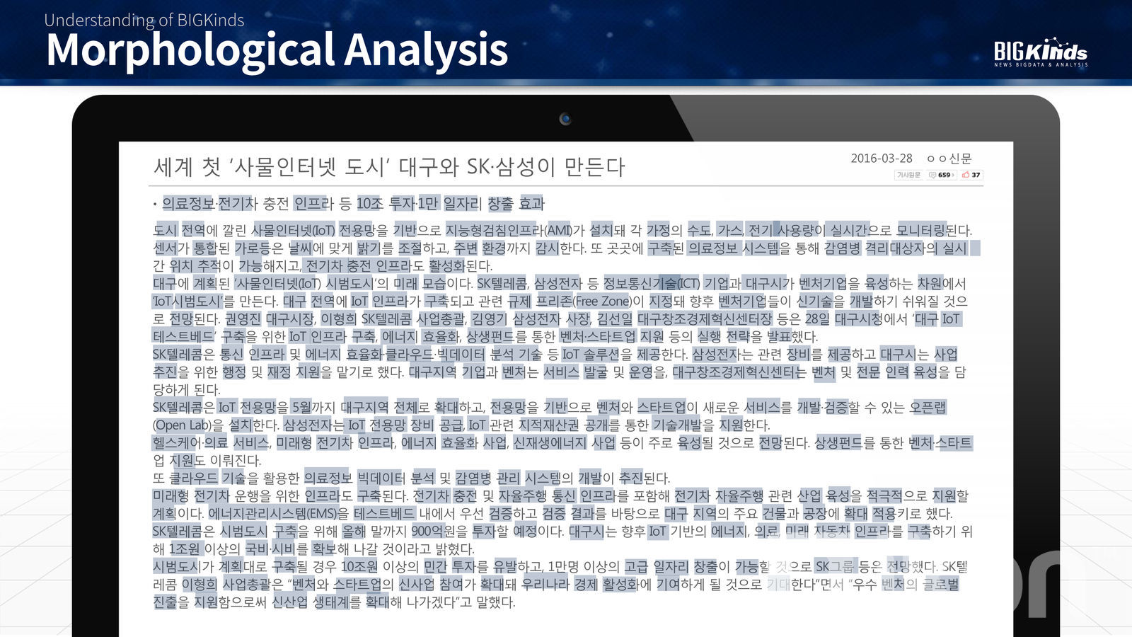 BigKinds нь Өмнөд Солонгосын тэргүүлэх хэвлэл мэдээллийн компаниудаас сүүлийн 28 жилийн туршид цуглуулсан 42 сая гаруй өгүүлэл бүхий мэдээллийн архивт суурилсан анализ хийх процесс юм.