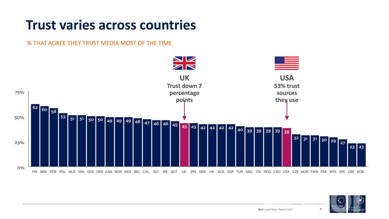 Энэхүү тайлангаас бас нэг онцолж харах өнцөг нь улс орнуудын хүлээн авагчид олон нийтийн мэдээллийн хэрэгсэлдээ (ОНМХ) хэр зэрэг итгэж буйг харуулах итгэлийн индексийг харуулжээ. 36 орноос хамгийн өндөр оноо авсан нь Финланд байв. Тус улсын иргэдийн 62 хувь нь ОНМХ-дээ итгэдэг гэсэн бол олон улсын сэтгүүлчдийн хурал болж буй Өмнөд Солонгосын хэрэглэгчдийн ердөө 23 хувь нь л ОНМХ-дээ итгэдэг гэж хариулсан байна.