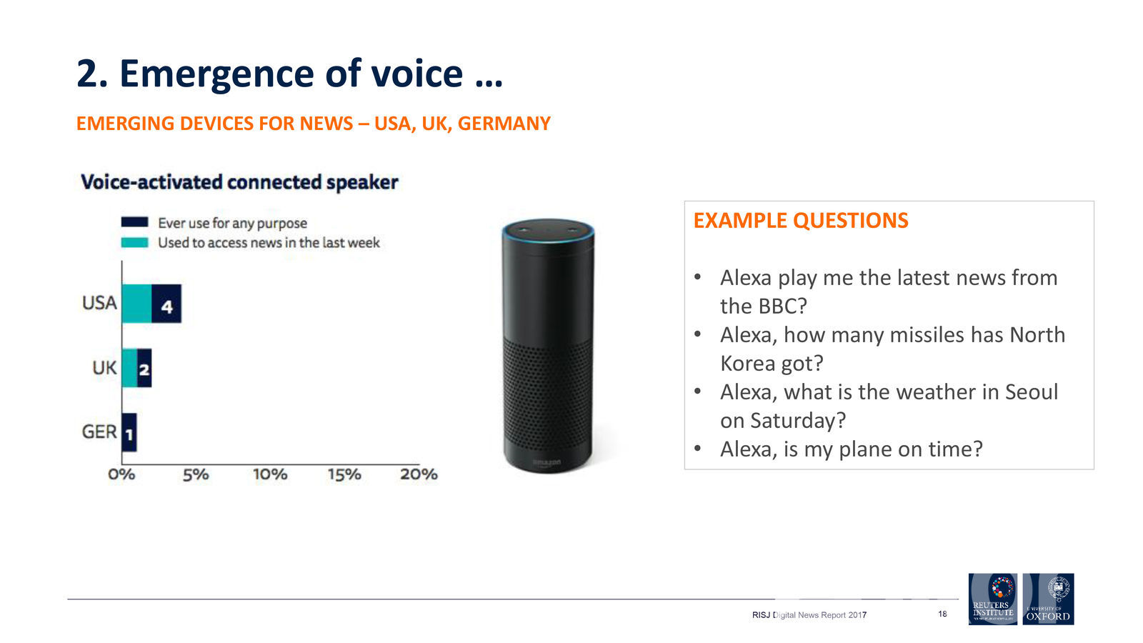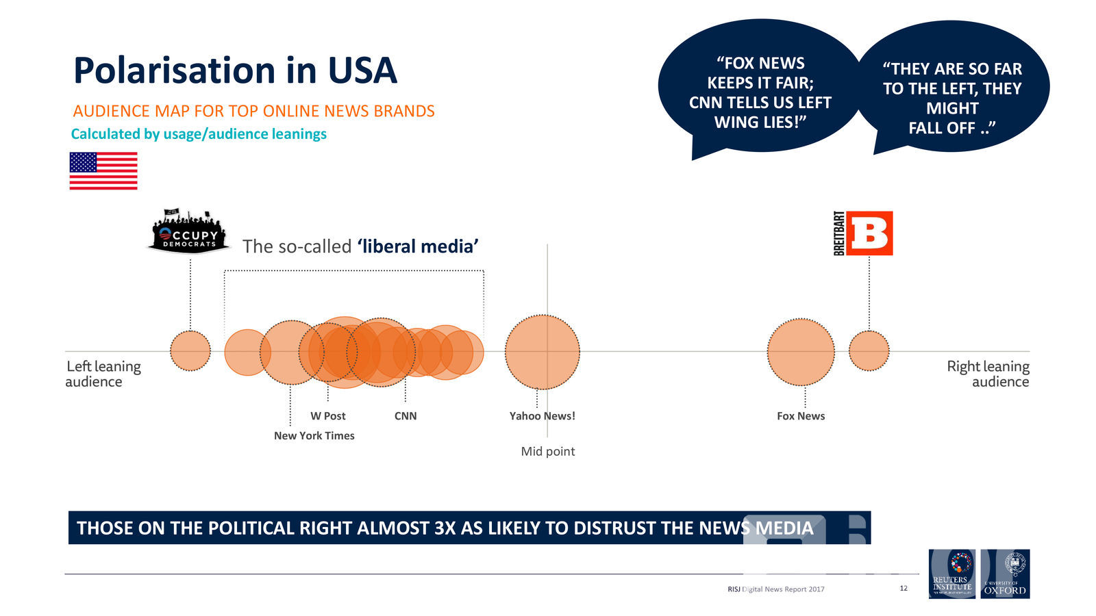 Дижитал тайлангаас онцлох хэсгүүдийг дурдвал дээрх 36 орны ялангуяа олон улсын хэмжээний мэдээ мэдээллийн сувгуудын олон ургальч байдлыг судалсан нь анхаарал татаж байв. Тухайлбал, АНУ-ын хүлээн авагчдын хувьд өөрсдийн мэдээлэл авдаг сувгуудаа улстөрийн ямар үзэл баримталдаг тухайд саналыг нь авахад төвийг сахисан буюу аль ч талыг нь голчилдоггүй хэвлэл мэдээллийн хэрэгсэлд зөвхөн Yahoo News л дөхөж очсон байлаа. Харин CNN, New York Times, The Washington Post зэрэг шилдэг хэвлэл мэдээллийн хэрэгсэл зүүний хүлээн авагчдын хэрэгсэл болсон байгаа бол эсрэг талд буюу барууны үзэл баримтлалаар мэдээж Fox News, Breitbart нар нэрлэгджээ.