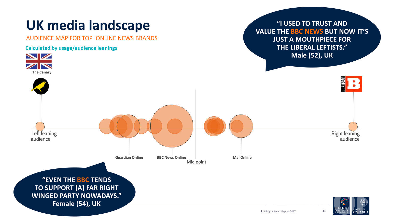 Харин Их Британийн хувьд голын шугаман дээр байрлах хэвлэл мэдээллийн хэрэгсэл байсангүй. Зүүнээс голын шугаманд дөхөж очсон нь BBC л байв. Алдарт The Guardian ч мэдээж зүүн талд байрласан байгааг та харж байна.