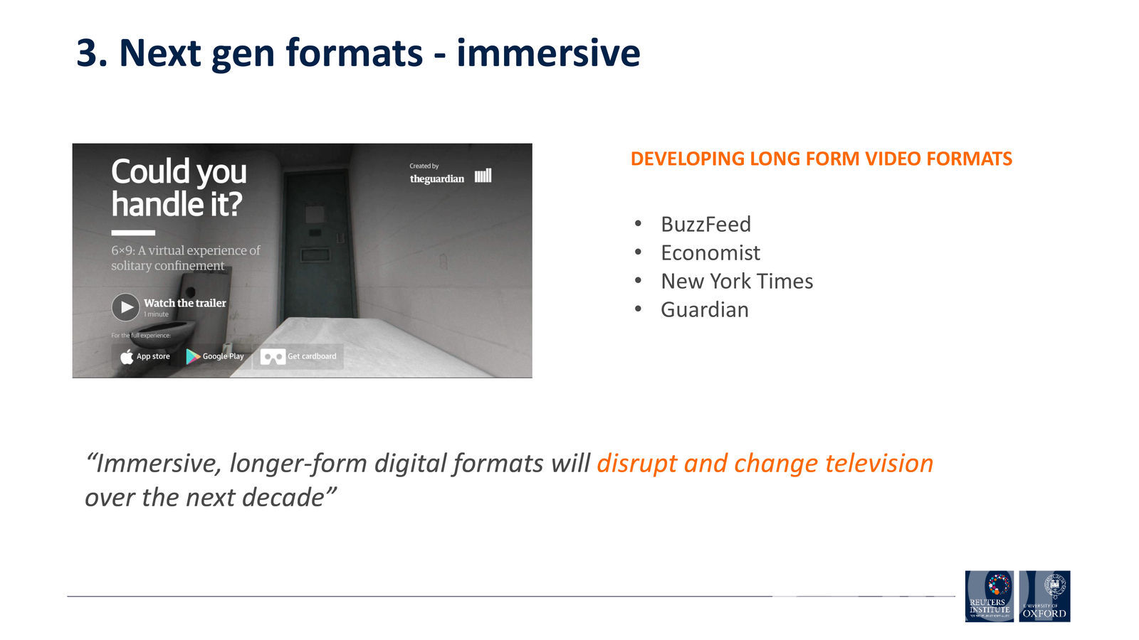 The Guardian хэрэглэгчиддээ аливаа нэг агуулгыг бүрэн гүйцэт буюу газар дээр нь очсон мэт сэтгэгдэл төрүүлэхүйц VR контентуудыг амжилттай бүтээж байгаа бөгөөд ингэхдээ төрөл бүрийн сэдвийн хүрээнд таны төсөөллийг бодит болгож байна. Жишээ нь, эрэн сурвалжлах сэтгүүл зүйг энэ технологитой хослуулсанаар хэрэглэгчийг аливаа нэг гэмт хэргийн үйл явцыг яг юу болсонг тухайн орчинд нь виртуал байдлаар үзүүлж байна.