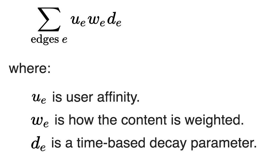 We- үзүүрүүдийн жингийн хэмжүүр юм. Тухайлбал, сэтгэгдэл бичих (comment), сэтгэл хөдлөл үзүүлэх (emotion) зэрэг үйлдлүүд нь таалагдсанаа илэрхийлээс (like) илүү жин татна. Үзүүр бүр тодорхой оноогоор үнэлэгдэнэ. Хэрвээ хэрэглэгч нэг байгууллагын хуудас дээр сэтгэгдэл бичсэн бол зөвхөн лайк дараад өнгөрсөн хуудсаас дээгүүр эрэмбэлэгдэх боломжтой.
