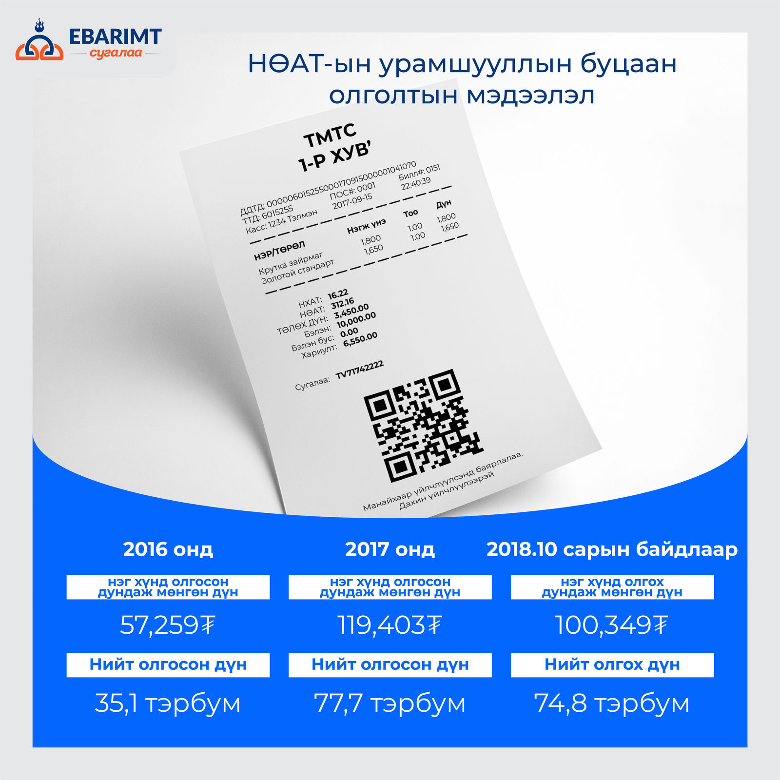 -Хуучин бол ebarimt системд гурван сувгаар буюу компьютерээс ebarimt.mn сайтад орж, гар утасны аппликэшнээр, 131313 тусгай дугаарт мессеж илгээж бүртгүүлдэг байсан. Бүртгэлийг иргэдэд түвэг чирэгдэл багатай байлгах үүднээс хялбар бүртгэлийг нэвтрүүлэхээр эхний ээлжинд арилжааны банкуудад хандсан. Ингэснээр банкууд шинэ пос машин нэвтрүүлж, тус машинд картаа уншуулж бэлэн бусаар төлбөр төлбөл баримт нь автоматаар хэрэглэгчийн нэр дээр бүртгэгдэх шийдлийг нэвтрүүлж байна.