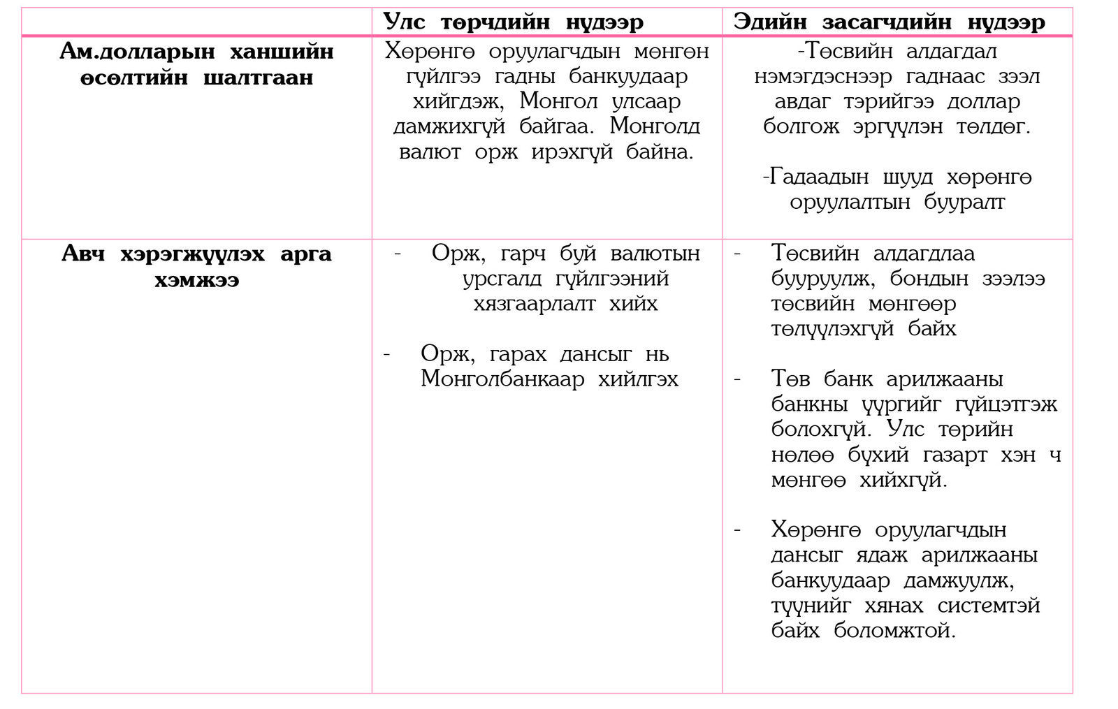 Эцэст нь бид үр дагавар дээр нь арга хэмжээ авахаас илүү суурь ужиг шалтгаан руу орох нь зүйтэй. Ядаж л төсвийн алдагдлаа багасгаад, нэмж зээл авахаа больчихвол долларын огцом гарах урсгал бий болохгүй. Өнгөрсөн зургаан сард л гэхэд "Дим сам" бондын төлөлт хийхэд зах зээлээс доллар татаж, долларын эсрэг төгрөгийн ханш 50 төгрөгөөр суларсан. Хэлж өгөвч чих нь цоорхой, хийж өгөвч сав нь цоорхой гэдэг манай улс төрд л байна даа. Харамсалтай.