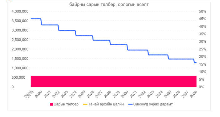 Сар бүр ягаан зураасын хэмжээнд тогтмол мөнгө төлнө. Харин танай өрхийн орлого 2 жил тутамд багадаа 6 хувиар өсдөг буюу шар зураас үүнийг харуулж байна. Хамгийн гол нь байрны төлбөрийн орлогод эзлэх хувь байнга буурч байгааг цэнхэр зураас харуулж байна. Цэнхэр, шар зураас дээр огтлолцох үед орлогын чинь ердөө 25 хувь нь л байрны төлбөрт зарцуулагдана гэсэн үг. Өөрөөр хэлбэл сар бүрийн тог цахилгаан, ус хэрэглэсний мөнгө шиг л бага дүн болно. Энэ хугацаа хэзээ эсэх нь Бат-Эрдэнэд их сонирхолтой санагдав. Тэрээр байрны төлбөрөө тасралтгүй 10 жил орчим л төлөхөд энэ хугацаанд ирж байна. Үнэндээ хугацаа нь 20 жил юм шиг боловч үлдсэн 10 жил нь хичнээн хөнгөн болохыг харж болно. Бодит байдал дээр өрхүүд 10 жил ч хүлээдэггүй. Тэд 8 жил орчимд багтаагаад илүү том байр руу шилждэг.