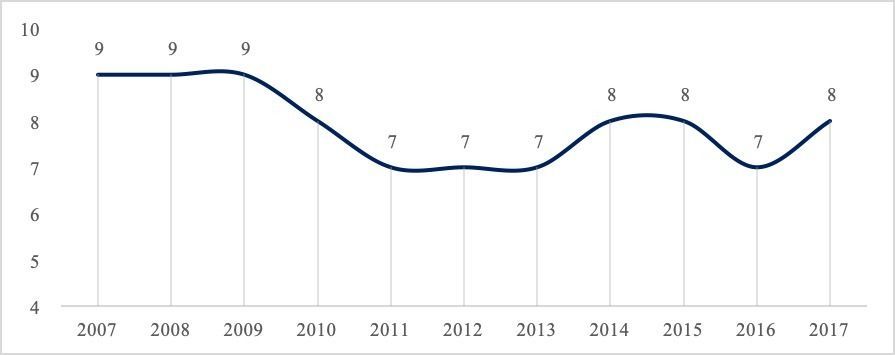 График 1, Улсын нэгдсэн төсвийн зарлагад эрүүл мэндийн зардлын эзлэх хувь
