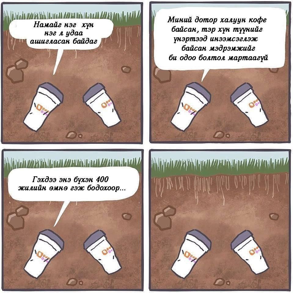 Манай гэр бүлийн хувьд баяр ёслолд зориулан аль эсвэл аялал зугаалгаар явахдаа нэг удаагийн аяга, халбага, сэрээ хэрэглэхээ больсон. Гадуур гарахдаа тогтмол өөрсдийн усны сав, аяга, халбага, сэрээгээ цүнхлээд явдаг. Мөн аль болох гэрээсээ ойр зуур идэх зүйлсээ бэлдээд савлаад гардаг тул гаднаас бэлэн бүтээгдэхүүн худалдан авч сав баглаа боодлын хуванцар хаягдал бараг гаргадаггүй.