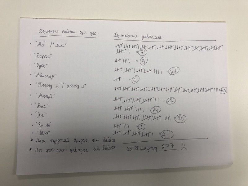 Тийм учраас би өөрийн орсон подкастаа дахин дахин сонсож, хэрэглэж байгаа сул үгсээ цаасан дээр бичээд, сонсох тоолондоо тоолоод явсан. Анхааралтай сонстол анх сонссоноос ч илүү хэцүү санагдаж байлаа. Тодруулбал, эхний 23 минут 38 секундийг сонсоод цаасан дээр тоолох зай ч байхгүй болсон ба үүнийг гаргаснаар хангалттай дүр зураг авч чадсан гэж бодсон. Тэрхүү тэмдэглэсэн цаасныхаа зургийг доор орууллаа: