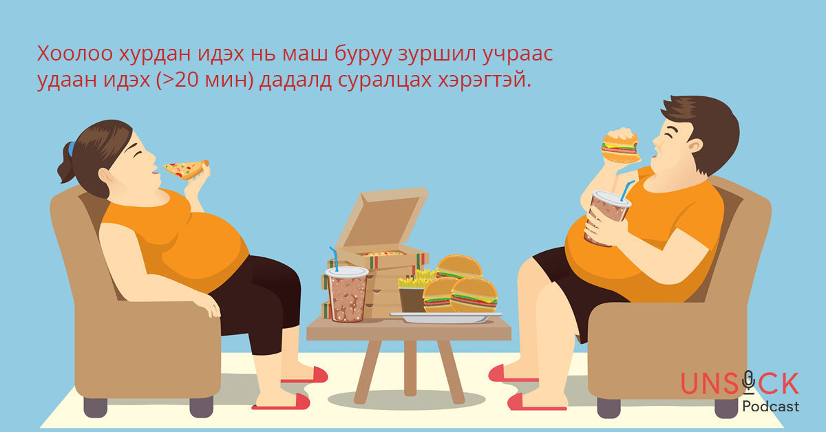 Та хоол идэх бүртээ ухаалаг утас эсвэл цаг ашиглан 20 минутаас дээш хугацаагаар хоол идэж сурах хэрэгтэй. Яагаад гэвэл ходоодонд хоол орж эхэлсэнээс хойш 20 минутын дараа ходоод гэдэсний гормон, рецептор тархи руу цадсан мэдрэмжийг үүсгэж байдаг. Хэрвээ та хоолоо хурдан идвэл удаан хооллосон хэмжээнээсээ 2-3 дахин их идэхэд хүргэнэ. Хоолоо удаан идэж цагаа уртасгахын тулд аль болох удаан зажлах, идсэнийхээ дараа юм ярих, шингэн зүйл уух зэргээр амсхийж байх хэрэгтэй.