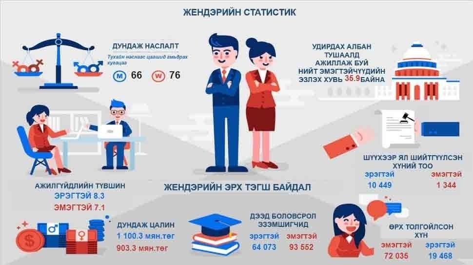 Үндэсний статистикийн хорооны мэдээллээр 2018 оны жилийн эцэст эмэгтэйчүүдийн хөдөлмөр эрхлэлтийн түвшин 51 хувь байгаа нь эрэгтэйчүүдийнхээс 14.3 хувиар бага байгаа бөгөөд 2018 оны жилийн эцсийн байдлаар эмэгтэйчүүдийн дундаж цалин эрэгтэйчүүдийнхээ 18 хувиар бага байна. Эдийн засгийн идэвхгүй хүн амд эмэгтэйчүүдийн эзлэх хувь өндөр байна. 2018 оны эцсээр энэ хувь 63.3 хувь болжээ. Хүүхэд харсан шалтгаанаар ажилгүй байгаа эмэгтэйчүүдийн эзлэх хувь 14.5 хувь.Удирдах албан тушаалд ажиллаж буй эмэгтэйчүүдийн эзлэх хувь 35.9.