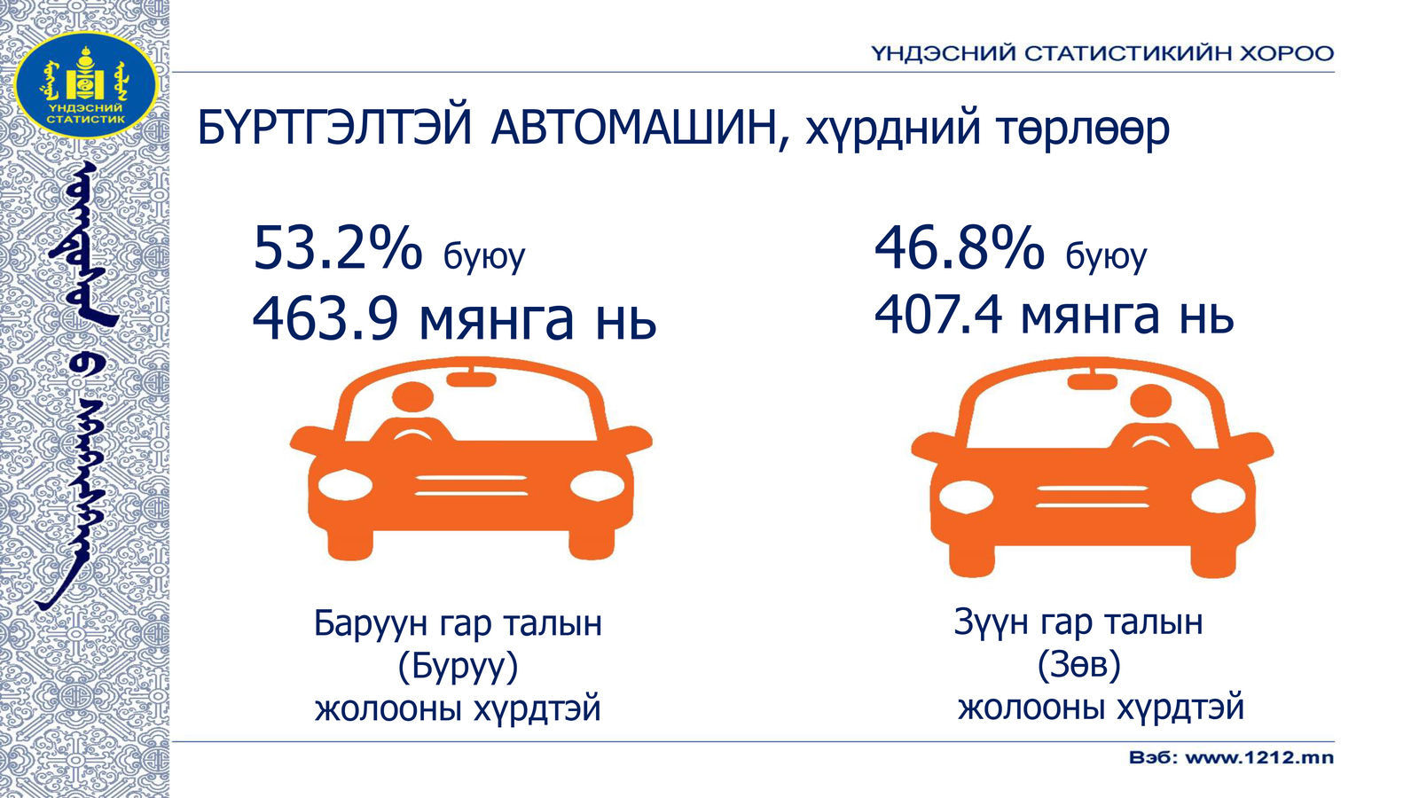 Бас нэг анхаарал татаж буй тоо бол нийт осол гаргасан автомашины 72 хувь нь буруу талдаа жолооны хүрдтэй автомашин гэсэн Тээврийн цагдаагийн албаны судалгааны дүн.
