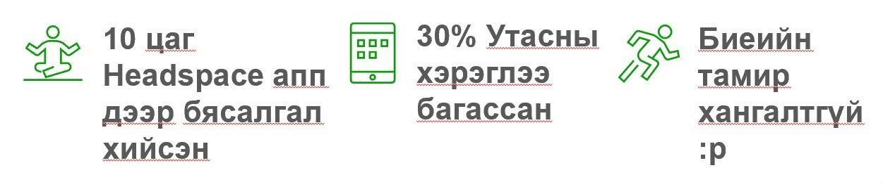 Ямар ч байсан жилийн эхнээс утасны хэрэглээгээ 30 орчим хувь багасгасан. Энэ нь өдөр бүр цагийг минь хэмнэхээс гадна цаагуураа миний нойр, анхаарал, ажлын бүтээмжид багагүй эерэг нөлөө үзүүлж байгаа санагдсан. Тийм учраас энэ жил улам багасгах тал дээр анхаарч ажиллана.