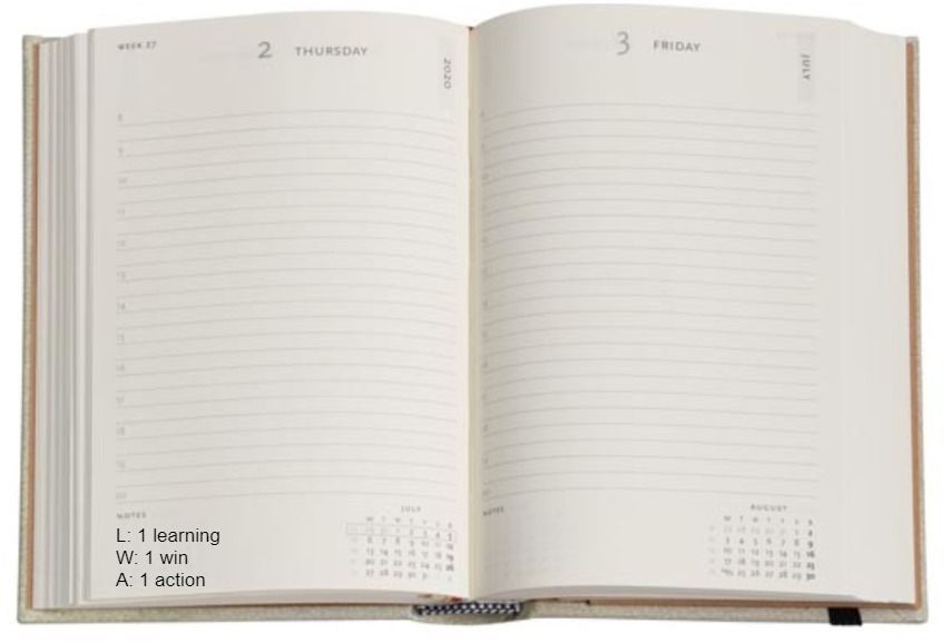 Мөн хуудас бүрийн доор нь богино тэмдэглэл хийх зай байсан — хуудасны дээд хэсэгт өдрийн ажлаа тоочдог бол, тэр доод зайнд өдөр бүрийн ажлыг дүгнэх боломжтой юм байна гэж харсан. Өдөр бүр өдрөө дүгнэхдээ бас тодорхой загварын дагуу явбал миний хувьд тууштай байх магадлал илүү юм байна гээд би “L”, “W”, “A” гэсэн гурван мөр гаргаад бичдэг.