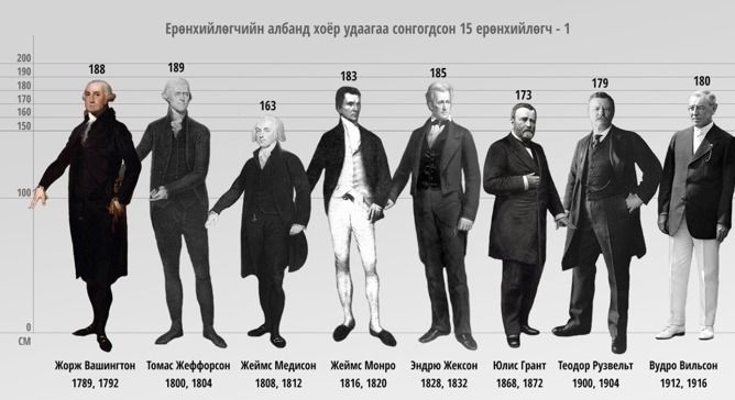 Америкийн 44 ерөнхийлөгчөөс Жеймс Медисон, Бенжамин Харрисон, Мартин Ван Бурен, Вилльям Мккенли, Жон Адамс, Жон Күйнси Адамс, Захари Тейлор нарын долоон ерөнхийлөгч л нэг цаг үед төрсөн америк эрчүүдийн дундаж өндрөөс намхан байгаа юм. Харин бусад ерөнхийлөгч нар өөрийн үеийнхэн дотроос дунджаар 7.23 см өндөр хүмүүс байгаа юм. АНУ-ын түүхэн дэх хамгийн өндөр ерөнхийлөгч болох Авраам Линкольн, Линдон Жонсон нар 193 см байсан бөгөөд өөрийн үеийн эрчүүдийн дундаж өндрөөс 23-25 см өндөр байсан ажээ. Иймээс ерөнхийлөгч нар ихэнхдээ дунджаас дээгүүр өндөртэй хүмүүс байна гэсэн дүгнэлт гарч байгаа юм.