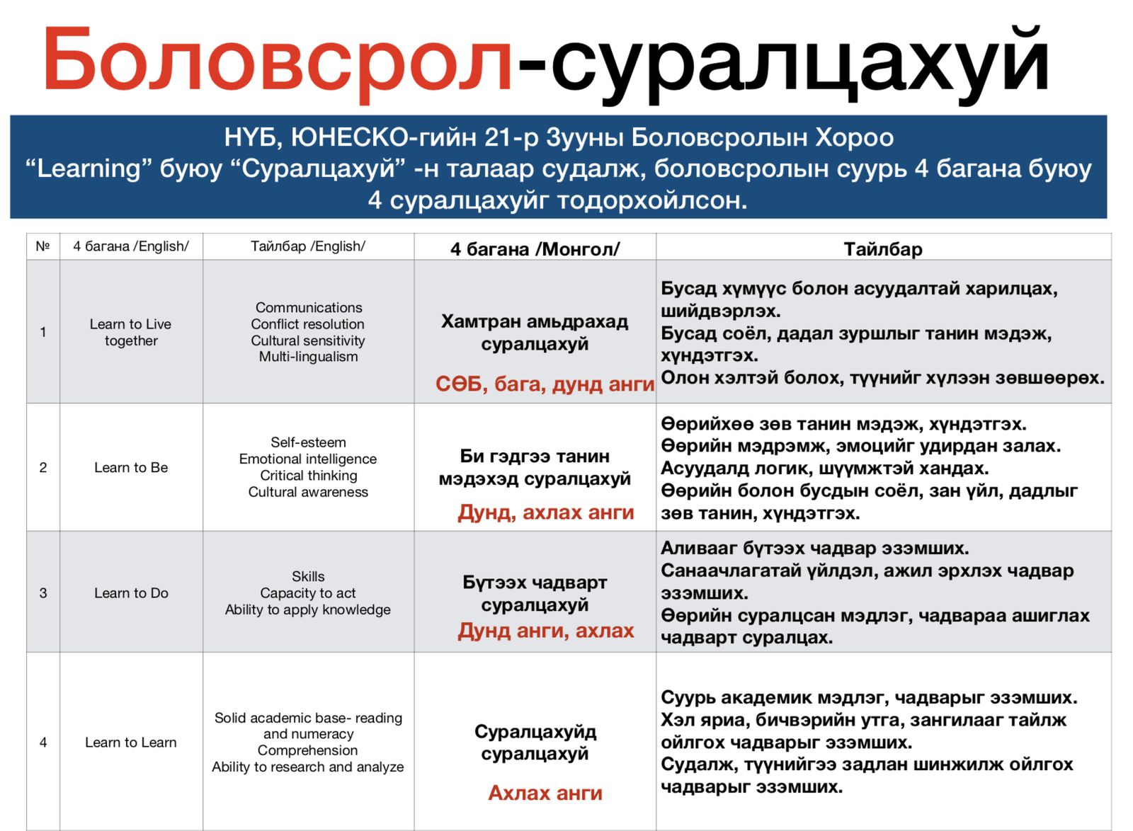 Хүснэгт 1, Боловсролын үндсэн 4 зорилт