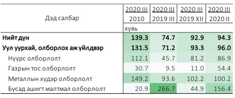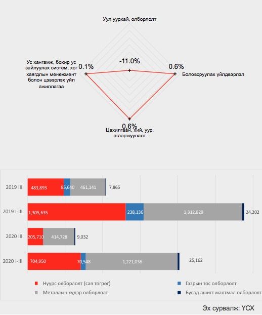 Аж үйлдвэрийн салбарын нийт үйлдвэрлэлийн 64.4 хувийг уул уурхай, олборлох аж үйлдвэрлэл эзэлдэг. Гэвч тус салбарын энэ жилийн эхний улирлын үйлдвэрлэл гадаадын зах зээл дээрх түүхий эдийн үнэ унасан, гол хэрэглэгч болох Хятад улс цар тахлын улмаас хилээ хаасан, эрэлт огцом унасан зэрэг шалтгааны улмаас, өмнөх оны мөн үеэс 30 хувиар бага үйлдвэрлэл гаргасан бөгөөд үүнд нүүрсний олборлолт 600.7 тэрбум төгрөгөөр буюу 46 хувиар, газрын тос олборлолт 167.6 тэрбум төгрөгөөр буюу 70.4% хувиар, металлын хүдэр олборлолт 91.8 тэрбум төгрөгөөр буюу 7.0% хувиар буурсан голлон нөлөөлжээ.