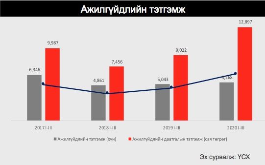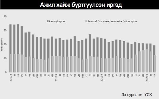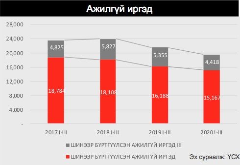 2020 оны эхний 3 сард нийт бүртгэлтэй ажилгүй иргэдийн тоо өмнөх оны мөн үеэс 10.8 хувиар, өмнөх сараас 6.1 хувиар буурсан байна. Гэсэн хэдий ч МҮХАҮТ-н 3-р сарын сүүлд 1504 аж ахуйн нэгжийг хамруулан авсан судалгаагаар судалгаанд оролцогчдын 56% нь ажлын цагийн зохицуулалт хийсэн, 33% нь ажиллагсдаа түр болон бүр мөсөн чөлөөлсөн байна.