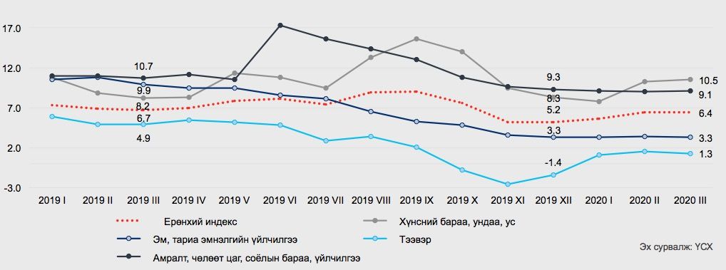 2020 оны 3-р сарын бодит дүнгээр хэрэглээний бараа үйлчилгээний үнэ улсын хэмжээнд өмнөх сараас 0.7 хувь, өмнөх оны эцсээс 2.9 хувь, өмнөх оны мөн үеэс 6.4 хувиар өссөн байна. Үүнд голлон нөлөөлсөн хүчин зүйл нь хүнсний бараа, ундаа, усны бүлгийн дүнгийн 10.5 хувийн өсөлт тэр дундаа мах махан бүтээгдэхүүний дэд бүлгийн 20.2 хувийн өсөлт юм.