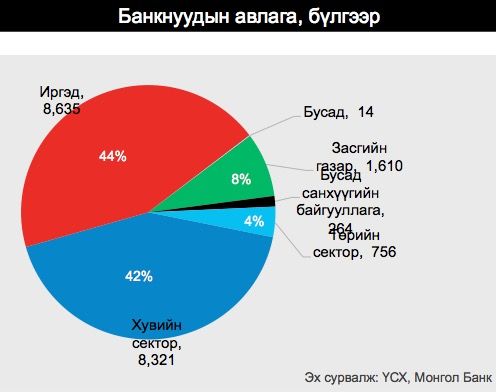 Банкнуудаас олгосон зээлийн дийлэнх нь буюу 85-с дээш хувь нь иргэд болон бизнесүүдэд очсон байна. Харин иргэдийн авсан зээлийн 40.4 хувийг ипотекийн зээл, 26.6 хувийг цалингийн зээл., 14.7 хувийг жижиг дунд үйлдвэрлэлийн зээл тус тус эзэлж байна. Төрөөс 4-р сарын 3-нд орон сууцны ипотекийн хөнгөлөлттэй хүүтэй зээлийн үндсэн болон хүүгийн төлбөрийг нэг удаа 3 хүртэлх сараар хойшлуулах шийдвэр гаргаж 4-р сарын 10-нд үүнийгээ уртасган 6 сар болгосон байна.