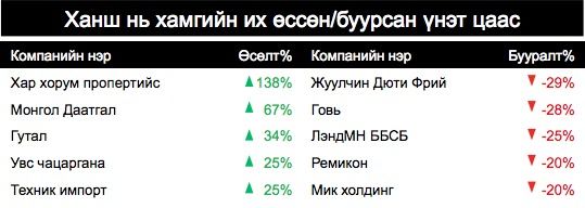 Ханшийн хувьд хамгийн их өсөлттэй 5 компанид Хар Хорум Пропертийс тэргүүлсэн нь уг компани үнэт цаасны арилжаагаа жил гаруй хугацаанд зогсоосны эцэст буцаан сэргээсэнтэй холбоотой болов уу. Түүнчлэн уг жагсаалтад цар тахлын үед дархлааг дэмжиж халдвараас сэргийлэх чадвартай чацаргана үйлдвэрлэгчийн хувьцаа 25 хувийн өсөлттэй багтсан байна.Харин алдагдал их хүлээсэн компаниудад аялал жуулчлалаас хамааралтай салбарууд болон барилгын материал үйлдвэрлэгч мөн санхүүгийн байгууллага зэрэг байна.