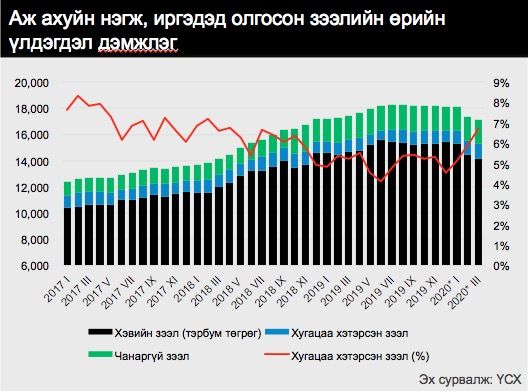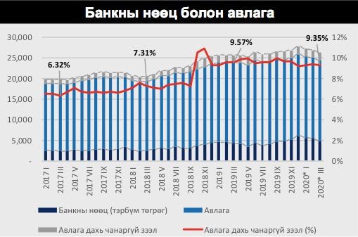 Хугацаа хэтэрсэн зээлийн өрийн үлдэгдэл 2020 оны 3 дугаар сарын эцэст 1.2 их наяд төгрөгт хүрч, өмнөх сараас 11.6 хувиар, өмнөх оны мөн үеэс 25.9 хувиар өссөн үзүүлэлттэй байна. Хугацаа хэтэрсэн зээлийн өрийн үлдэгдэл нийт зээлийн өрийн үлдэгдлийн 6.7 хувийг эзэлж байгаа нь мөн л өмнөх оны мөн үеэс 1.5 пунктээр өссөн дүн юм. Ялангуяа COVID-19-н эсрэг арга хэмжээ авч эхэлсэн үе буюу 2-р сараас эхлэн зээлийн чанар мэдэгдэхүйц буурч эхэлсэн байна. Банкнуудын зээлийг 1-р сарын дүнтэй харьцуулж харахад нийт зээлд эзлэх хэвийн зээлийн хэмжээ 2.1 хувиар буурч харин хугацаа хэтэрсэн зээлийн хэмжээ 2.6 хувиар ихэссэн байна. Түүнчлэн он гарснаас хойш тэтгэврийн зээлээс бусад зээлийн шинээр олгосон дүн болон эргэн төлөлтийн дүн аль аль нь буурсан байна. Энэ нэг талаараа бизнесүүдэд цар тахлын нөлөөтэйгөөр хүндрэл учирч зээлээ эргэн төлөн чадваргүйд хүрээд байгаа, нөгөөтээгүүр иргэд болон бизнесүүдэд олгосон зээлийн нөхцөлд өөрчлөлт оруулж ангиллуудыг бууруулахгөи байх боломжтой болгосонтой холбоотой юм.