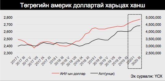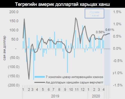 Нөхцөл байдалтай холбож үзвэл америк долларын ханш харьцангуй тогтвортой байгаа нь Монгол Банкны төгрөгийн гадаад валюттай харьцах ханшийн тогтвортой байдлыг хангах үүднээс он гарснаас хойш цэвэр дүнгээр 389.7 сая америк доллар зах зээлд нийлүүлсний үр дүн юм. Энэхүү интервенц нь өнгөрсөн оны мөн үетэй харьцуулбал 509 сая америк доллараар нэмэгдсэн үзүүлэлт боллоо.