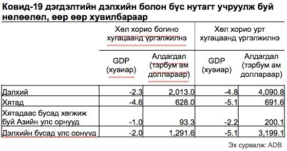 COVID-19 цар тахал нь хэд хэдэн сувгаар дамжин Монголын эдийн засагт нөлөөлж буй. Үүнд дотоодын хэрэглээ түр хугацаагаар бууралтад орох, бизнесийн орчин болон аж ахуйн нэгжүүдийн ирээдүйн талаарх үзэл бодолд өөрчлөлт орж, тодорхой бус байдал бий болсноор хөрөнгө оруулалт багасах, тээвэр ложистик доголдсоноос бараа үйлчилгээний нийлүүлэлтэд хоцрогдол гарах, бэлэн мөнгөний хомстолд орох, аялал жуулчлал болон бизнес аяллын тоо хэмжээ огцом унах, үйлдвэрлэлийн хангамж нийлүүлэлтийн сувгууд ба худалдаа арилжаагаар дамжин эдийн засгийн бусад хэсгүүдэд эрэлтийн цочрол үүсэх мөн эрүүл мэндийн салбарын хэрэгцээ зардал огцом өсөх зэрэг багтана. Цар тахлын тархалтыг хязгаарлах зорилгоор тавьсан хөл хорион арга хэмжээнүүд нь дотоод болон гадаад зах зээлийн эрэлт нийлүүлтэнд цочролыг үүсгэж эдийн засгийг хурдацтай сааруулж байна. Азийн Хөгжлийн Банкны 4-р сард гаргасан тайланд дурдсанаар 2020 онд COVID-19 цар тахлын нөлөөгөөр Хөгжиж буй Азийн улс орнуудын эдийн засгийн өсөлт өмнөх оны 5.2 хувиасаа 2.2 хувь хүртлээ бууж удаашрах, Монгол улсын хувьд 2.1 хувийн өсөлттэй, 2021 онд 4.6 хувь байх таамаглалыг гаргажээ.