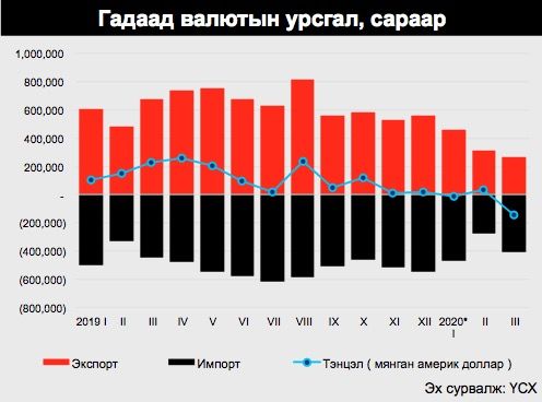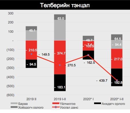 2019 оны мөн үед төлбөрийн тэнцэл 182.6 сая америк долларын ашигтай гарч байсан бол энэ жил 265.5 сая америк доллароор буурч 82.8 саяын алдагдалтай гарсан байна.