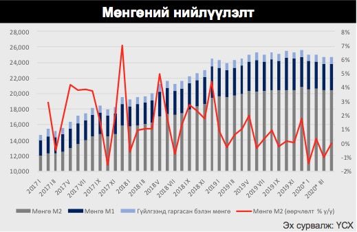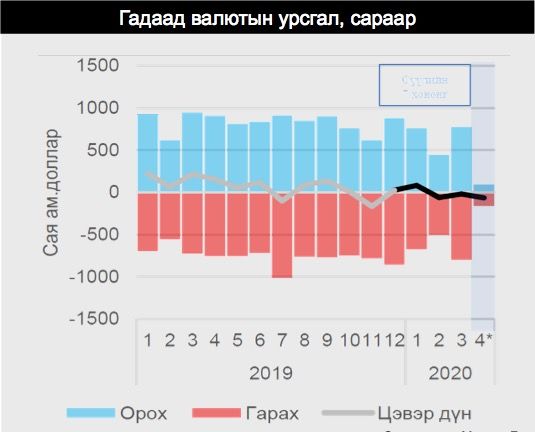 Гадаад валютын орох урсгал 2020 оны 4-р сарын 8-ны байдлаар өмнөх оны мөн үеэс 22 хувиар буурсан бол гарах урсгал нь зөвхөн 0.1 хувиар буурсан байна. Энэхүү дотоодруу орж ирэх валютын урсгал багассан нь гадаад худалдааны эргэлт буурсантай, тэр дундаа нүүрсний экспорт буурсантай холбоотой.