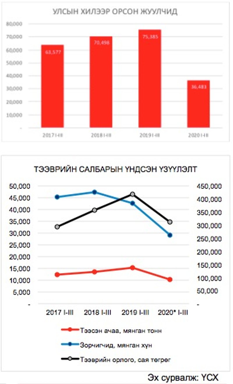 Харин ачаа тээврийн салбарын хувьд КОВИД-19 эдийн засгийн хямралын хохирлыг хамгийн ихээр амсаад буй салбаруудын нэг юм. Улсын хэмжээн бүх төрлийн тээврээр 10.2 сая тонн ачаа ачсан нь өмнөх оны мөн үеэс 33.4 хувь буурсан үзүүлэлт юм. Бүх төрлийн тээврээр зорчсон зорчигчдын тоо ч мөн ижил хэмжээгээр, 31.4 хувиар буурсан байна. Ийнхүү салбарын нийт орлого өмнөх үеийнхээс 25 хувиар, өмнөх улирлаас 37 хувиар унаад буй. Харин төмөр замын тээврийн орлого өссөн нь уул уурхайн бүтээгдэхүүн тээвэрлэлт нэмэгдсэнтэй холбоотой юм.