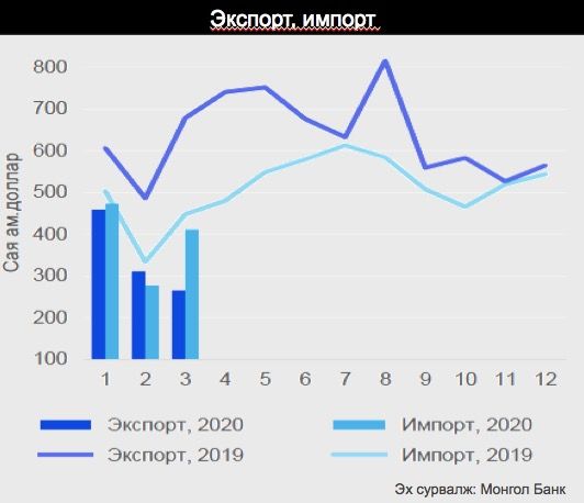 2020 оны эхний 3 сард гадаад худалдааны нийт бараа эргэлт өмнөх үеийнхээс 860 сая америк доллар буюу 28 хувиар буурч, экспорт 42 хувиар, импорт 10 хувиар буурсан үзүүлэлттэй байна. Үүнд түүхий эдийн үнийн уналт болон гадаад улсуудын хил боомтын хязгаарлалт дотоодын болон гадаадын зах зээл дэх эрэлтийн уналт зэрэг нөлөөлсөн болно.