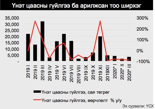 Үнэт цаасны арилжаагаар 2020 оны эхний улирлын дүнгээр 9.6 тэрбум төгрөгийн гүйлгээ хийгдэж, өмнөх оны мөн үеэс 58.0 тэрбум төгрөгөөр буюу 85.8 хувиар буурсан байна. Харин 3 дугаар сард 3.4 тэрбум төгрөгийн гүйлгээ хийгдэж, 10.4 сая ширхэг үнэт цаас арилжаалагдсан нь өмнөх оны мөн үеэс гүйлгээ 89.5 хувиар арилжсан үнэт цаасны тоо 90.8 хувиар тус тус буурсан байна.